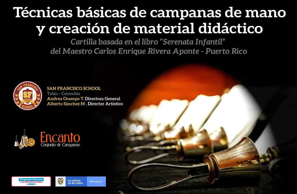 The purpose of this audiovisual material is to provide a virtual video tool on the basic techniques of playing bronze handbells and handchimes. It is aimed at handbell ringers and handbell ensembles in Colombia and around the world, based on the description of handbell techniques by Maestro Carlos Enrique Rivera Aponte in his book “Serenata Infantil: Música Infantil del Folclor Puertorriqueño y Latinoamericano para Campanas de Mano,” Cantabile Series volume 1, 2013, page four (4). It is intended to be an audiovisual complement to the wonderful pedagogical and musical work presented by Maestro Rivera in his book.